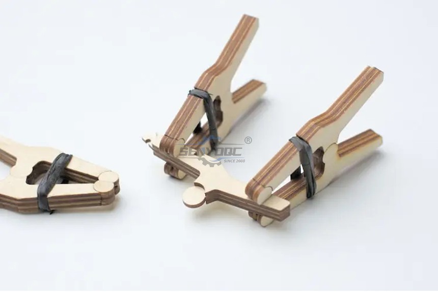 I cut all the parts on a laser cutter at my local maker space. Each clamp is made out of twelve parts: three parts each for the left and right main body of the clamp and three parts each for the jaw pads.